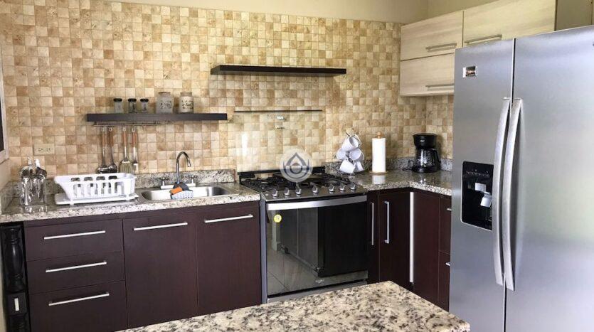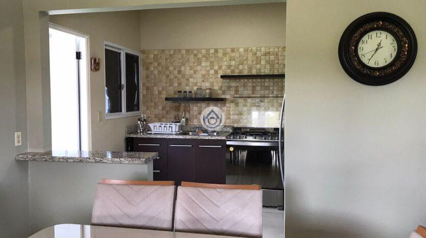 Upon entering the property we can notice wide spaces in the living room and dining room thanks to a double height ceiling, this makes the home fill with natural light. Then we find a semi-open kitchen, it has a breakfast bar, granite countertops, lower cabinets and includes appliances (stove, fridge), the kitchen connects with the closed laundry room, which includes a washer and dryer unit and water heater.