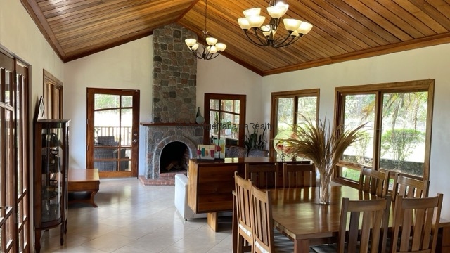 - Sala y comedor con detalles que incluyen una chimenea revestida en piedra.