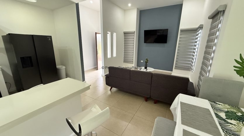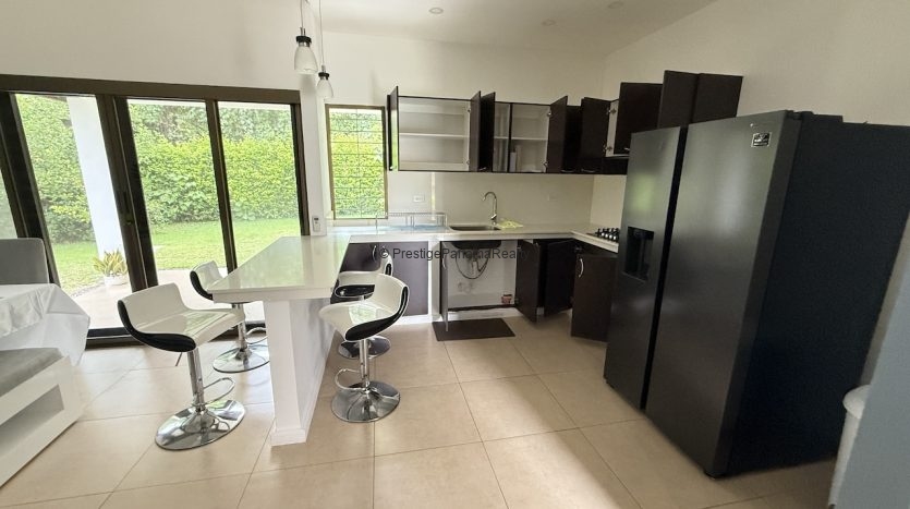 - Cocina abierta con barra desayunadora de 4 puestos, estufa empotrada, nevera y todos los elementos esenciales para cocinar cómodamente.