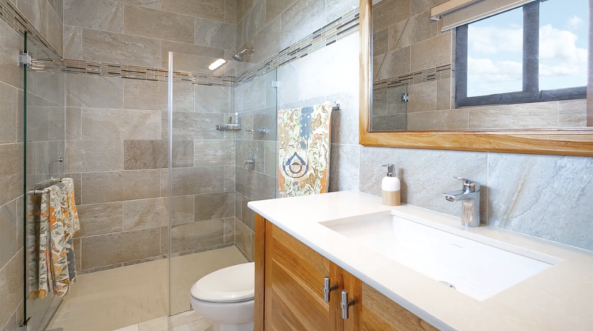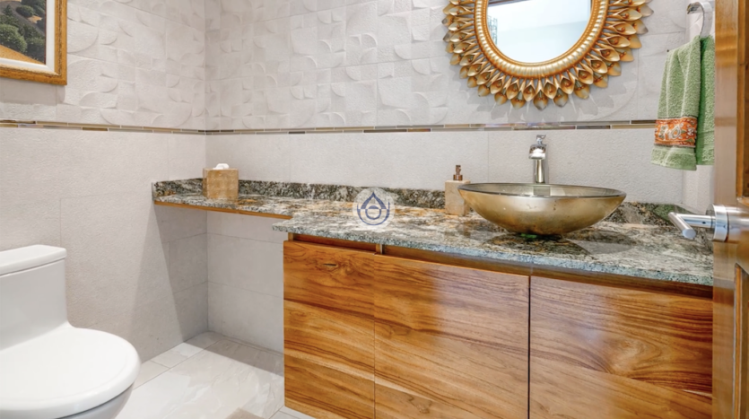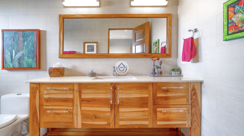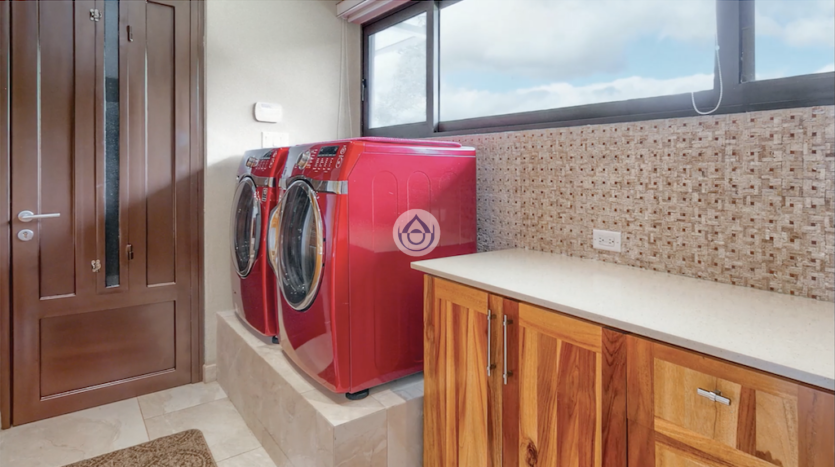 - Cuarto de lavado con bases elevadas y gabinetes de teca para almacenamiento eficiente.